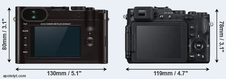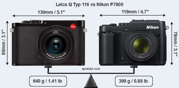 The side-by-side display below illustrates the physical size and weight of the Leica Q Typ 116 and the Nikon P7800. The two cameras are presented according to their relative size. Three successive views from the front, the top, and the rear are shown. All width, height and depth measures are rounded to the nearest millimeter.