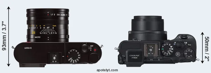 If the front view area (width x height) of the cameras is taken as an aggregate measure of their size, the Nikon P7800 is notably smaller (11 percent) than the Leica Q Typ 116. Moreover, the P7800 is substantially lighter (38 percent) than the Q Typ 116. In this context, it is worth noting that neither the Q Typ 116 nor the P7800 are weather-sealed.
