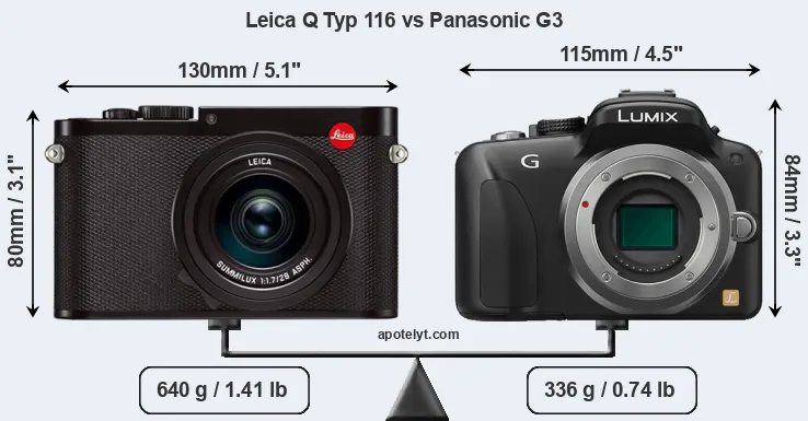 The physical size and weight of the Leica Q Typ 116 and the Panasonic G3 are illustrated in the side-by-side display below. The two cameras are presented according to their relative size. Three consecutive perspectives from the front, the top, and the back are available. All width, height and depth measures are rounded to the nearest millimeter.