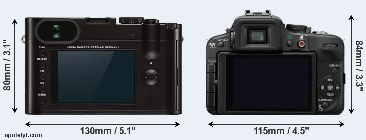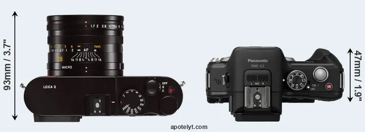 If the front view area (width x height) of the cameras is taken as an aggregate measure of their size, the Panasonic G3 is notably smaller (7 percent) than the Leica Q Typ 116. In this context, it is worth noting that neither the Q Typ 116 nor the G3 are weather-sealed.
