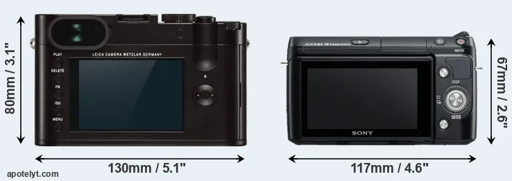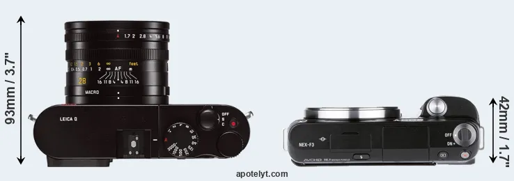 If the front view area (width x height) of the cameras is taken as an aggregate measure of their size, the Sony NEX-F3 is notably smaller (25 percent) than the Leica Q Typ 116. In this context, it is worth noting that neither the Q Typ 116 nor the NEX-F3 are weather-sealed.