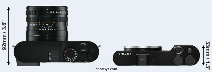 If the front view area (width x height) of the cameras is taken as an aggregate measure of their size, the Leica TL2 is notably smaller (11 percent) than the Leica Q2. It is worth mentioning in this context that the Q2 is splash and dust resistant, while the TL2 does not feature any corresponding weather-sealing.