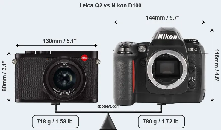 If the front view area (width x height) of the cameras is taken as an aggregate measure of their size, the Nikon D100 is considerably larger (61 percent) than the Leica Q2. It is worth mentioning in this context that the Q2 is splash and dust resistant, while the D100 does not feature any corresponding weather-sealing.