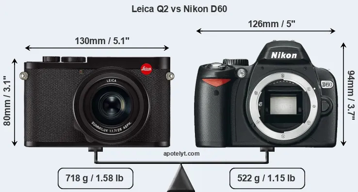 If the front view area (width x height) of the cameras is taken as an aggregate measure of their size, the Nikon D60 is notably larger (14 percent) than the Leica Q2. It is worth mentioning in this context that the Q2 is splash and dust resistant, while the D60 does not feature any corresponding weather-sealing.