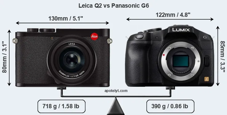 The side-by-side display below illustrates the physical size and weight of the Leica Q2 and the Panasonic G6. The two cameras are presented according to their relative size. Three consecutive perspectives from the front, the top, and the back are available. All width, height and depth dimensions are rounded to the nearest millimeter.