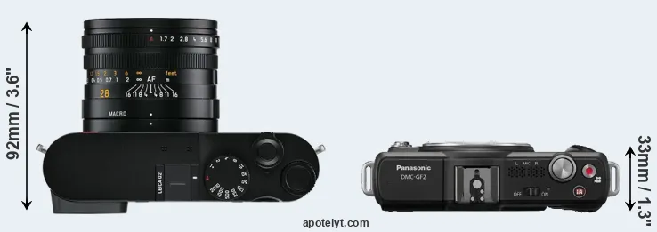 If the front view area (width x height) of the cameras is taken as an aggregate measure of their size, the Panasonic GF2 is notably smaller (26 percent) than the Leica Q2. It is worth mentioning in this context that the Q2 is splash and dust resistant, while the GF2 does not feature any corresponding weather-sealing.