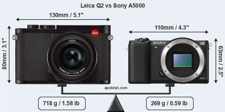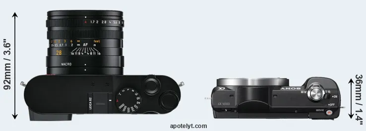 If the front view area (width x height) of the cameras is taken as an aggregate measure of their size, the Sony A5000 is considerably smaller (33 percent) than the Leica Q2. It is worth mentioning in this context that the Q2 is splash and dust resistant, while the A5000 does not feature any corresponding weather-sealing.