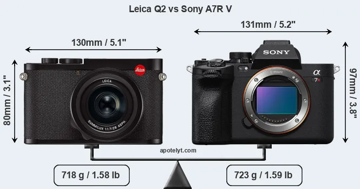The side-by-side display below illustrates the physical size and weight of the Leica Q2 and the Sony A7R V. The two cameras are presented according to their relative size. Three successive views from the front, the top, and the rear are shown. All width, height and depth measures are rounded to the nearest millimeter.