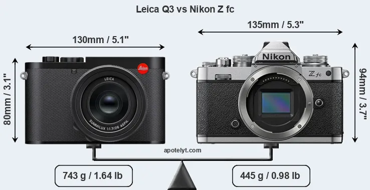 The Leica Q3 and the Nikon Z fc are two digital cameras that were announced, respectively, in May 2023 and June 2021. The Q3 is a fixed lens compact, while the Z fc is a mirrorless interchangeable lens camera. The cameras are based on a full frame (Q3) and an APS-C (Z fc) sensor. The Leica has a resolution of 60.3 megapixels, whereas the Nikon provides 20.7 MP.