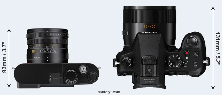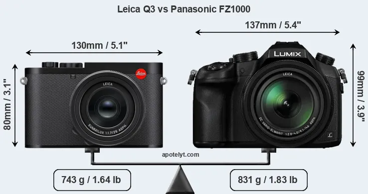 The side-by-side display below illustrates the physical size and weight of the Leica Q3 and the Panasonic FZ1000. The two cameras are presented according to their relative size. Three consecutive perspectives from the front, the top, and the back are available. All width, height and depth dimensions are rounded to the nearest millimeter.
