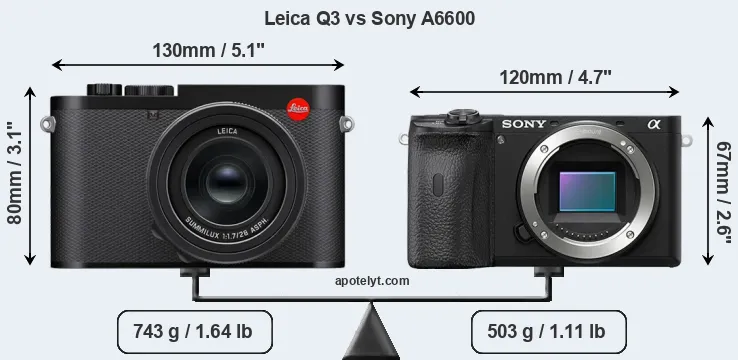 The physical size and weight of the Leica Q3 and the Sony A6600 are illustrated in the side-by-side display below. The two cameras are presented according to their relative size. Three consecutive perspectives from the front, the top, and the back are available. All size dimensions are rounded to the nearest millimeter.