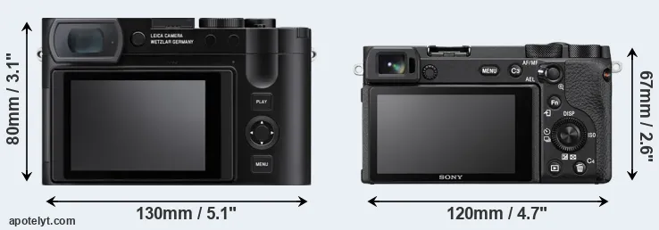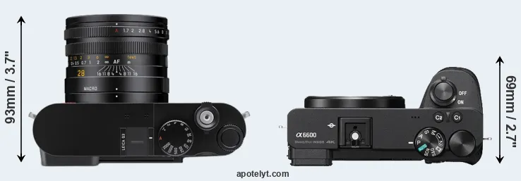 If the front view area (width x height) of the cameras is taken as an aggregate measure of their size, the Sony A6600 is notably smaller (23 percent) than the Leica Q3. In this context, it is worth noting that both cameras are splash and dust-proof and can, hence, be used in inclement weather conditions or harsh environments.