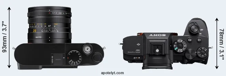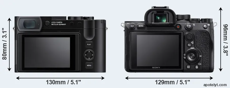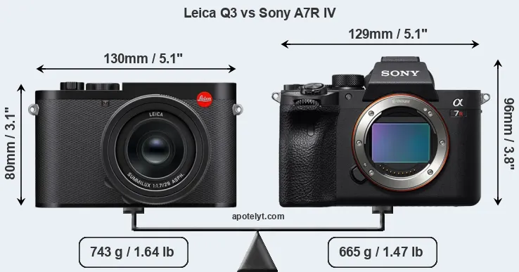 The above size and weight comparisons are to some extent incomplete and possibly misleading, as the Q3 has a lens built in, whereas the A7R IV is an interchangeable lens camera that requires a separate lens. Attaching the latter will add extra weight and bulk to the setup. You can compare the optics available for the A7R IV and their specifications in the Sony FE Lens Catalog.