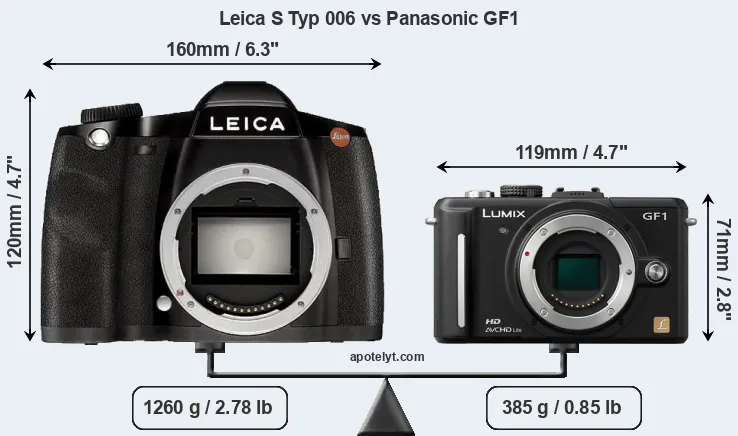 If the front view area (width x height) of the cameras is taken as an aggregate measure of their size, the Panasonic GF1 is considerably smaller (56 percent) than the Leica S Typ 006. Moreover, the GF1 is substantially lighter (69 percent) than the S Typ 006. It is worth mentioning in this context that the S Typ 006 is splash and dust resistant, while the GF1 does not feature any corresponding weather-sealing.