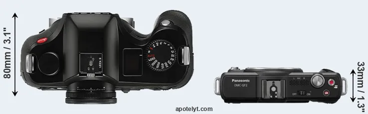 The side-by-side display below illustrates the physical size and weight of the Leica S Typ 006 and the Panasonic GF2. The two cameras are presented according to their relative size. Three successive views from the front, the top, and the rear are shown. All size dimensions are rounded to the nearest millimeter.