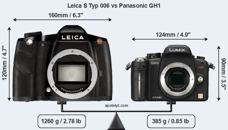 If the front view area (width x height) of the cameras is taken as an aggregate measure of their size, the Panasonic GH1 is considerably smaller (42 percent) than the Leica S Typ 006. Moreover, the GH1 is substantially lighter (69 percent) than the S Typ 006. It is worth mentioning in this context that the S Typ 006 is splash and dust resistant, while the GH1 does not feature any corresponding weather-sealing.