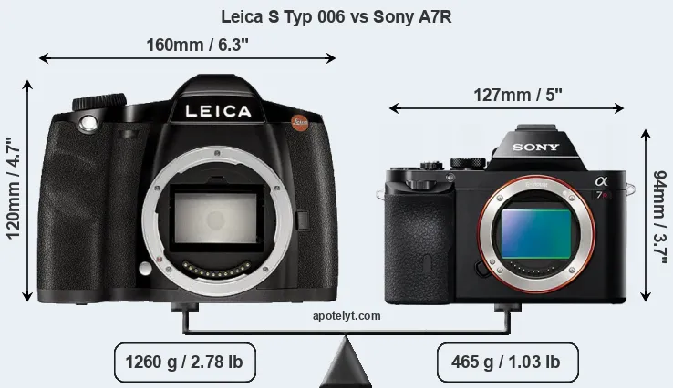 If the front view area (width x height) of the cameras is taken as an aggregate measure of their size, the Sony A7R is considerably smaller (38 percent) than the Leica S Typ 006. Moreover, the A7R is substantially lighter (63 percent) than the S Typ 006. In this context, it is worth noting that both cameras are splash and dust-proof and can, hence, be used in inclement weather conditions or harsh environments.