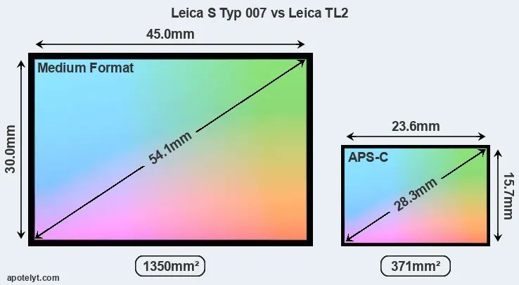 Of the two cameras under consideration, the Leica S Typ 007 features a medium format sensor and the Leica TL2 an APS-C sensor. The sensor area in the TL2 is 73 percent smaller. As a result of these sensor size differences, the cameras have a format factor of, respectively, 0.8 and 1.5. Both cameras have a native aspect ratio (sensor width to sensor height) of 3:2.