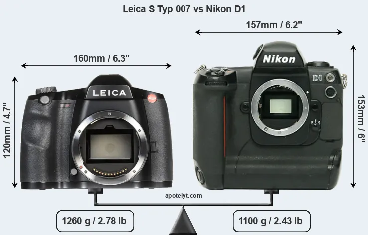 The side-by-side display below illustrates the physical size and weight of the Leica S Typ 007 and the Nikon D1. The two cameras are presented according to their relative size. Three consecutive perspectives from the front, the top, and the back are available. All width, height and depth measures are rounded to the nearest millimeter.