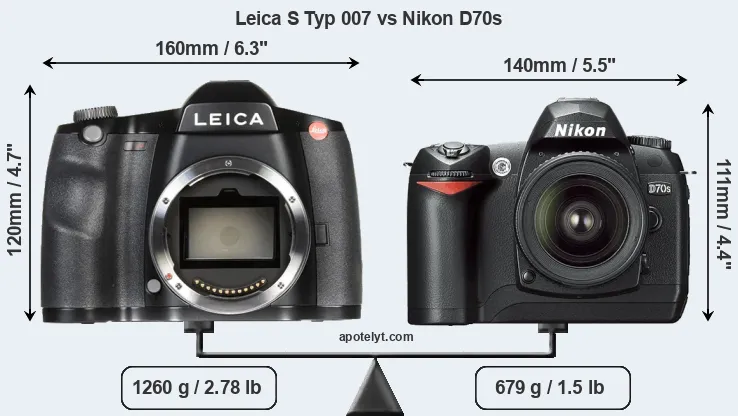 The physical size and weight of the Leica S Typ 007 and the Nikon D70s are illustrated in the side-by-side display below. The two cameras are presented according to their relative size. Three consecutive perspectives from the front, the top, and the back are available. All width, height and depth measures are rounded to the nearest millimeter.