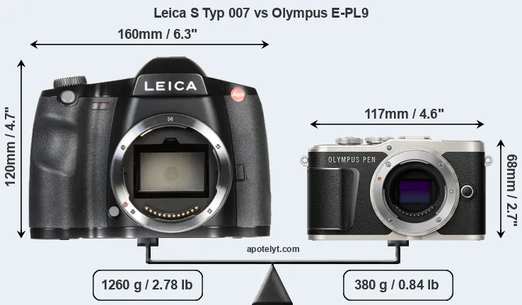 The side-by-side display below illustrates the physical size and weight of the Leica S Typ 007 and the Olympus E-PL9. The two cameras are presented according to their relative size. Three consecutive views from the front, the top, and the rear side are shown. All width, height and depth measures are rounded to the nearest millimeter.