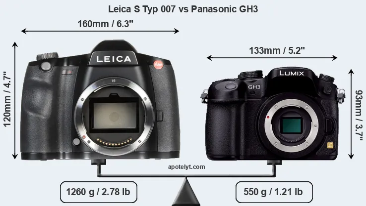 If the front view area (width x height) of the cameras is taken as an aggregate measure of their size, the Panasonic GH3 is considerably smaller (36 percent) than the Leica S Typ 007. Moreover, the GH3 is substantially lighter (56 percent) than the S Typ 007. In this context, it is worth noting that both cameras are splash and dust-proof and can, hence, be used in inclement weather conditions or harsh environments.