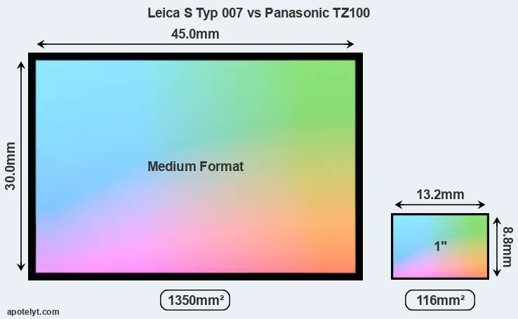 Of the two cameras under consideration, the Leica S Typ 007 features a medium format sensor and the Panasonic TZ100 an one-inch sensor. The sensor area in the TZ100 is 91 percent smaller. As a result of these sensor size differences, the cameras have a format factor of, respectively, 0.8 and 2.7. Both cameras have a native aspect ratio (sensor width to sensor height) of 3:2.