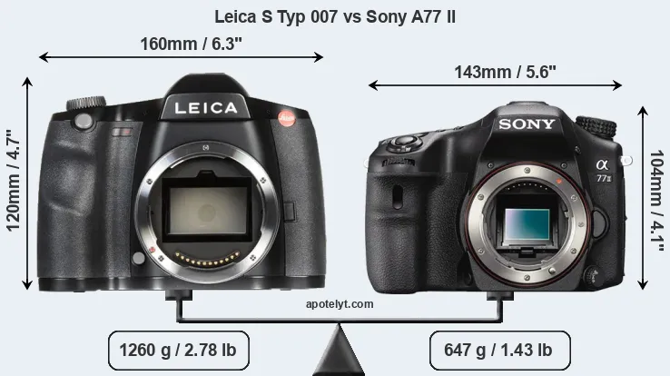 The physical size and weight of the Leica S Typ 007 and the Sony A77 II are illustrated in the side-by-side display below. The two cameras are presented according to their relative size. Three consecutive perspectives from the front, the top, and the back are available. All width, height and depth dimensions are rounded to the nearest millimeter.