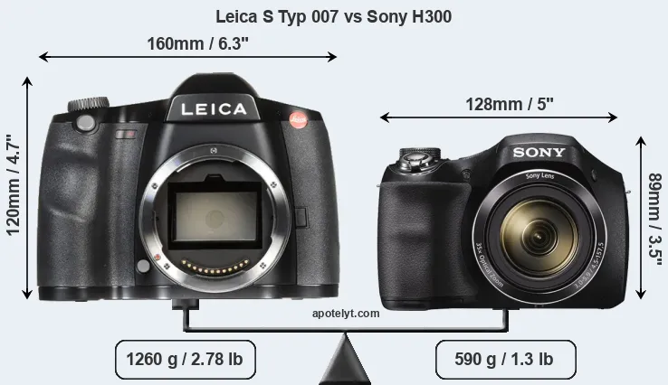 If the front view area (width x height) of the cameras is taken as an aggregate measure of their size, the Sony H300 is considerably smaller (41 percent) than the Leica S Typ 007. It is worth mentioning in this context that the S Typ 007 is splash and dust resistant, while the H300 does not feature any corresponding weather-sealing.