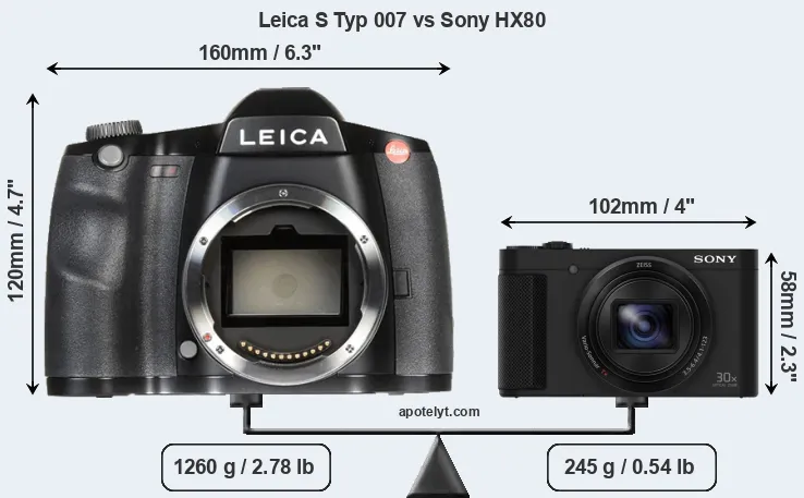 If the front view area (width x height) of the cameras is taken as an aggregate measure of their size, the Sony HX80 is considerably smaller (69 percent) than the Leica S Typ 007. It is worth mentioning in this context that the S Typ 007 is splash and dust resistant, while the HX80 does not feature any corresponding weather-sealing.