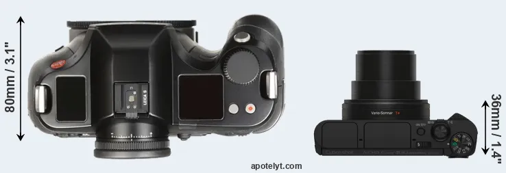 The side-by-side display below illustrates the physical size and weight of the Leica S Typ 007 and the Sony HX80. The two cameras are presented according to their relative size. Three consecutive perspectives from the front, the top, and the back are available. All size dimensions are rounded to the nearest millimeter.