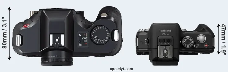 The side-by-side display below illustrates the physical size and weight of the Leica S2 and the Panasonic G3. The two cameras are presented according to their relative size. Three consecutive views from the front, the top, and the rear side are shown. All width, height and depth dimensions are rounded to the nearest millimeter.