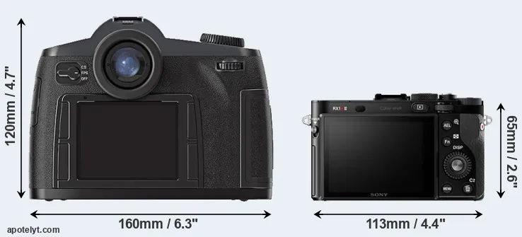 If the front view area (width x height) of the cameras is taken as an aggregate measure of their size, the Sony RX1R II is considerably smaller (62 percent) than the Leica S2. It is worth mentioning in this context that the S2 is splash and dust resistant, while the RX1R II does not feature any corresponding weather-sealing.