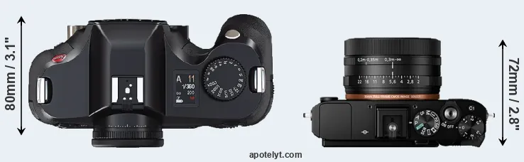 The side-by-side display below illustrates the physical size and weight of the Leica S2 and the Sony RX1R II. The two cameras are presented according to their relative size. Three consecutive perspectives from the front, the top, and the back are available. All size dimensions are rounded to the nearest millimeter.