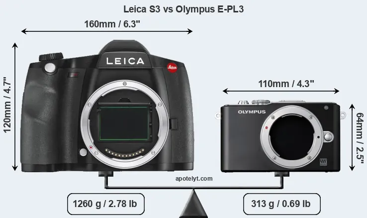 If the front view area (width x height) of the cameras is taken as an aggregate measure of their size, the Olympus E-PL3 is considerably smaller (63 percent) than the Leica S3. Moreover, the E-PL3 is substantially lighter (75 percent) than the S3. It is worth mentioning in this context that the S3 is splash and dust resistant, while the E-PL3 does not feature any corresponding weather-sealing.