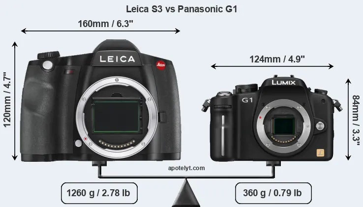 If the front view area (width x height) of the cameras is taken as an aggregate measure of their size, the Panasonic G1 is considerably smaller (46 percent) than the Leica S3. Moreover, the G1 is substantially lighter (71 percent) than the S3. It is worth mentioning in this context that the S3 is splash and dust resistant, while the G1 does not feature any corresponding weather-sealing.