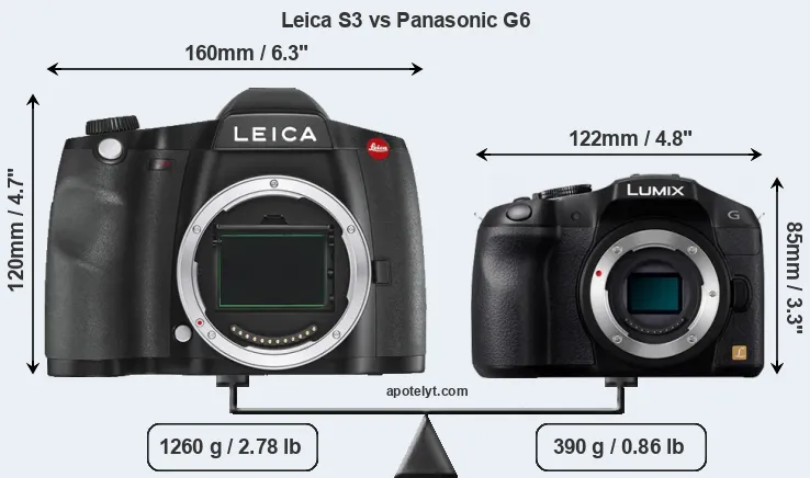 If the front view area (width x height) of the cameras is taken as an aggregate measure of their size, the Panasonic G6 is considerably smaller (46 percent) than the Leica S3. Moreover, the G6 is substantially lighter (69 percent) than the S3. It is worth mentioning in this context that the S3 is splash and dust resistant, while the G6 does not feature any corresponding weather-sealing.