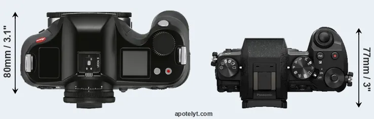 The side-by-side display below illustrates the physical size and weight of the Leica S3 and the Panasonic G7. The two cameras are presented according to their relative size. Three consecutive views from the front, the top, and the rear side are shown. All width, height and depth measures are rounded to the nearest millimeter.