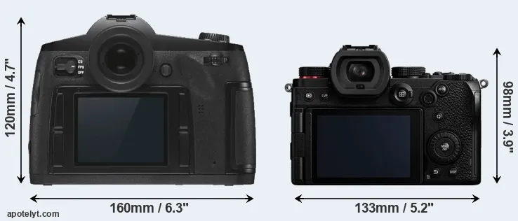 The side-by-side display below illustrates the physical size and weight of the Leica S3 and the Panasonic S5. The two cameras are presented according to their relative size. Three successive views from the front, the top, and the rear are shown. All width, height and depth dimensions are rounded to the nearest millimeter.