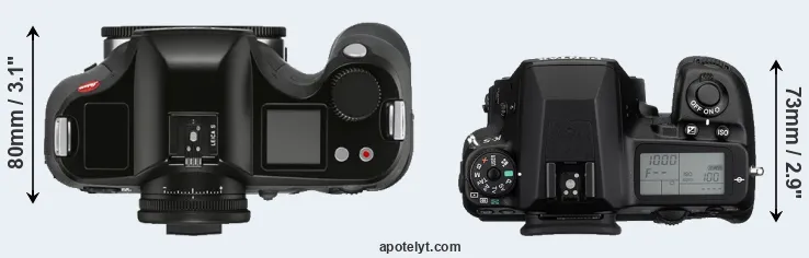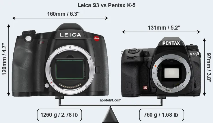 An illustration of the physical size and weight of the Leica S3 and the Pentax K-5 is provided in the side-by-side display below. The two cameras are presented according to their relative size. Three consecutive perspectives from the front, the top, and the back are available. All width, height and depth dimensions are rounded to the nearest millimeter.