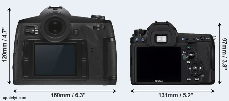 If the front view area (width x height) of the cameras is taken as an aggregate measure of their size, the Pentax K-5 is considerably smaller (34 percent) than the Leica S3. Moreover, the K-5 is substantially lighter (40 percent) than the S3. In this context, it is worth noting that both cameras are splash and dust-proof and can, hence, be used in inclement weather conditions or harsh environments.