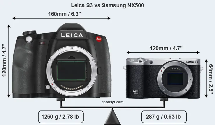 If the front view area (width x height) of the cameras is taken as an aggregate measure of their size, the Samsung NX500 is considerably smaller (60 percent) than the Leica S3. Moreover, the NX500 is substantially lighter (77 percent) than the S3. It is worth mentioning in this context that the S3 is splash and dust resistant, while the NX500 does not feature any corresponding weather-sealing.