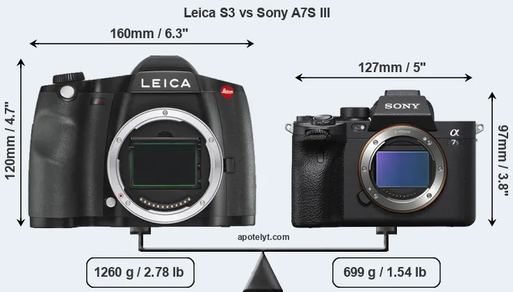 If the front view area (width x height) of the cameras is taken as an aggregate measure of their size, the Sony A7S III is considerably smaller (36 percent) than the Leica S3. Moreover, the A7S III is substantially lighter (45 percent) than the S3. In this context, it is worth noting that both cameras are splash and dust-proof and can, hence, be used in inclement weather conditions or harsh environments.