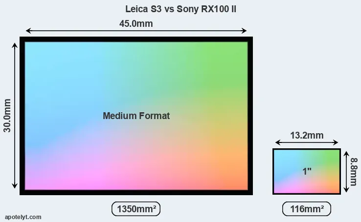 Of the two cameras under consideration, the Leica S3 features a medium format sensor and the Sony RX100 II an one-inch sensor. The sensor area in the RX100 II is 91 percent smaller. As a result of these sensor size differences, the cameras have a format factor of, respectively, 0.8 and 2.7. Both cameras have a native aspect ratio (sensor width to sensor height) of 3:2.