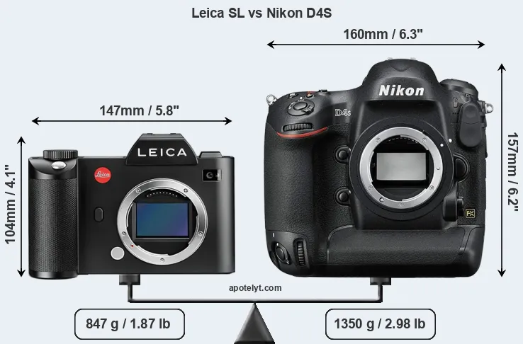 If the front view area (width x height) of the cameras is taken as an aggregate measure of their size, the Nikon D4S is considerably larger (64 percent) than the Leica SL. Moreover, the D4S is substantially heavier (59 percent) than the Leica SL. In this context, it is worth noting that both cameras are splash and dust-proof and can, hence, be used in inclement weather conditions or harsh environments.