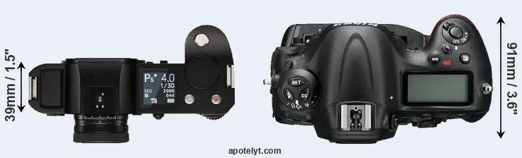 The physical size and weight of the Leica SL and the Nikon D4S are illustrated in the side-by-side display below. The two cameras are presented according to their relative size. Three consecutive views from the front, the top, and the rear side are shown. All width, height and depth measures are rounded to the nearest millimeter.