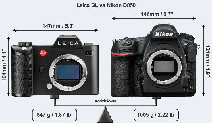 The physical size and weight of the Leica SL and the Nikon D850 are illustrated in the side-by-side display below. The two cameras are presented according to their relative size. Three consecutive perspectives from the front, the top, and the back are available. All size dimensions are rounded to the nearest millimeter.