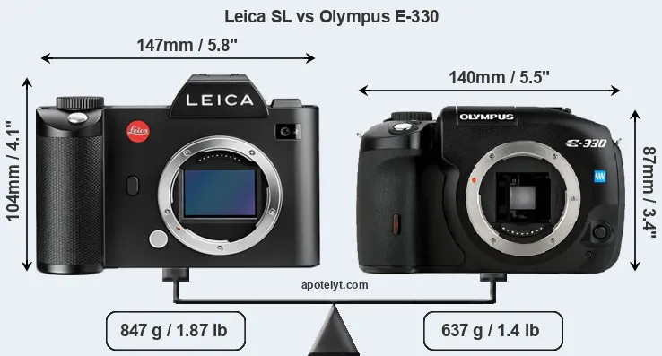 If the front view area (width x height) of the cameras is taken as an aggregate measure of their size, the Olympus E-330 is notably smaller (20 percent) than the Leica SL. Moreover, the E-330 is markedly lighter (25 percent) than the Leica SL. It is worth mentioning in this context that the Leica SL is splash and dust resistant, while the E-330 does not feature any corresponding weather-sealing.