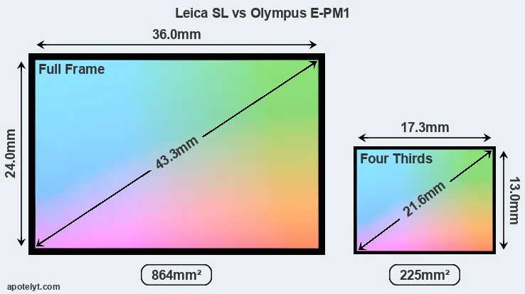Of the two cameras under consideration, the Leica SL features a full frame sensor and the Olympus E-PM1 a Four Thirds sensor. The sensor area in the E-PM1 is 74 percent smaller. As a result of these sensor size differences, the cameras have a format factor of, respectively, 1.0 and 2.0. The sensor in the Leica SL has a native 3:2 aspect ratio, while the one in the E-PM1 offers a 4:3 aspect.