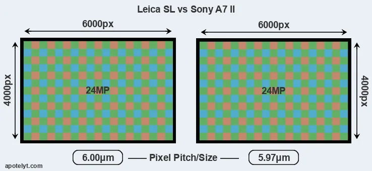 Even though the Leica SL has a slightly larger sensor, both cameras offer the same resolution of 24 megapixels. This implies that the Leica SL has a lower pixel density and larger individual pixels (with a pixel pitch of 6.00μm versus 5.97μm for the A7 II), which gives it a potential advantage in terms of light gathering capacity. In addition, the Leica SL is a somewhat more recent model (by 10 months) than the A7 II, and its sensor might have benefitted from technological advances during this time. Coming back to sensor resolution, it should be mentioned that the Leica SL has no anti-alias filter installed, so that it can capture all the detail its sensor resolves.